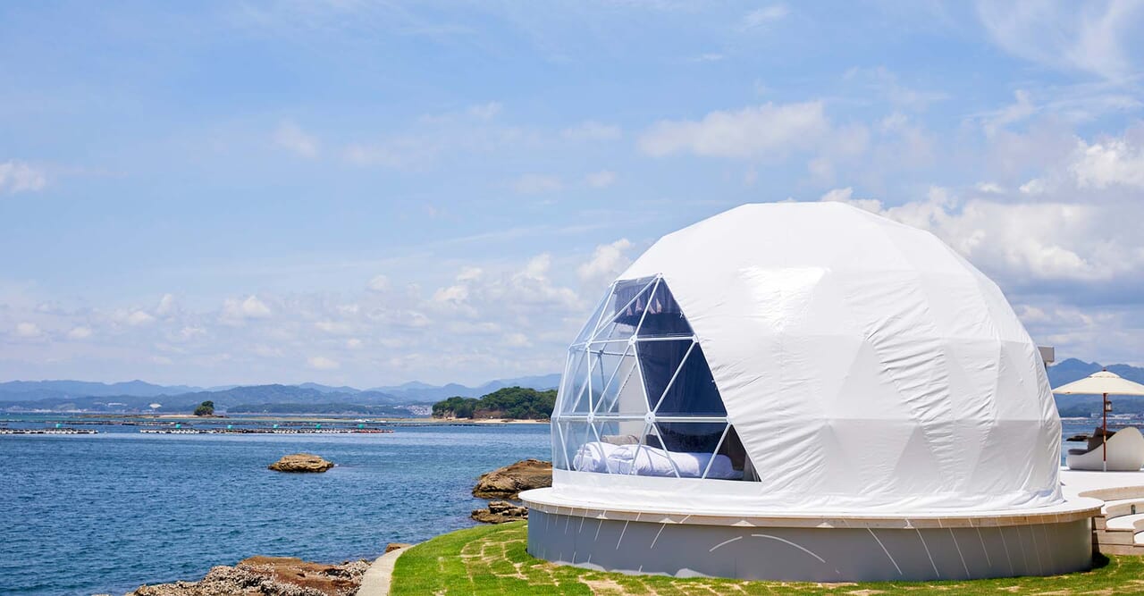 パノラマに広がる和歌山田辺湾の水面を眺めるオーシャンフロントのドーム型テント。